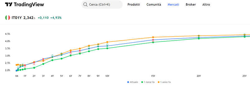 Grafico della curva dei rendimenti dei titoli di Stato italiani. Fonte: TRADINGVIEW
