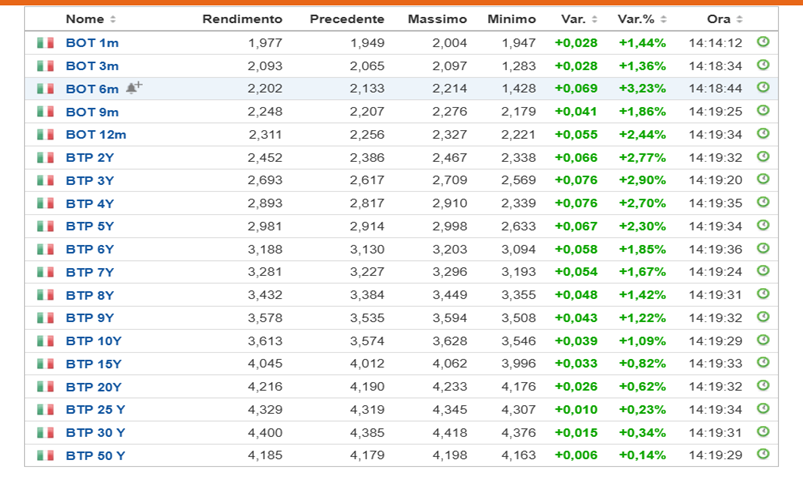 Tabella con i rendimenti dei Titoli di Stato italiani. Fonte: Investing